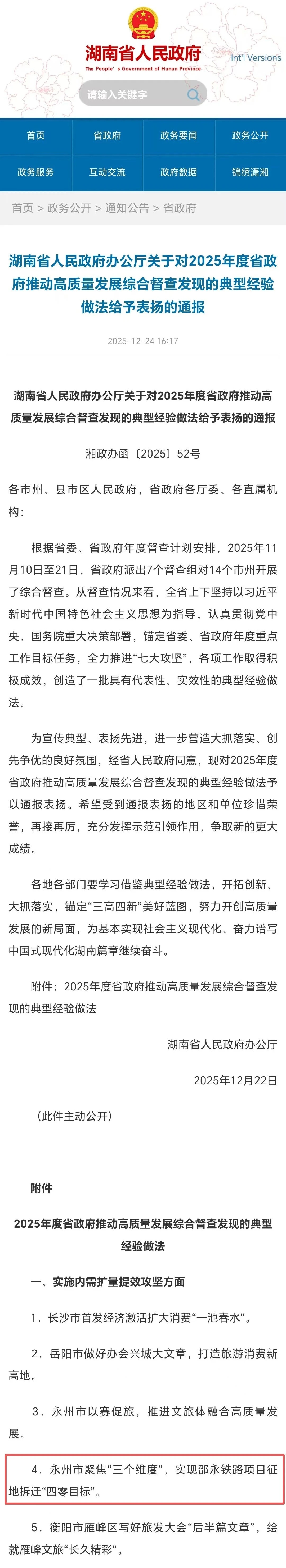 12月22日,湖南省人民政府办公厅发布《关于对2025年度省政府推动高质量发展综合督查发现的典型经验做法给予表扬的通报》,永州市聚焦“三个维度”实现邵永铁路项目征地拆迁“四零目标”被作为实施内需扩量提效攻坚方面的典型经验做法予以通报表扬。