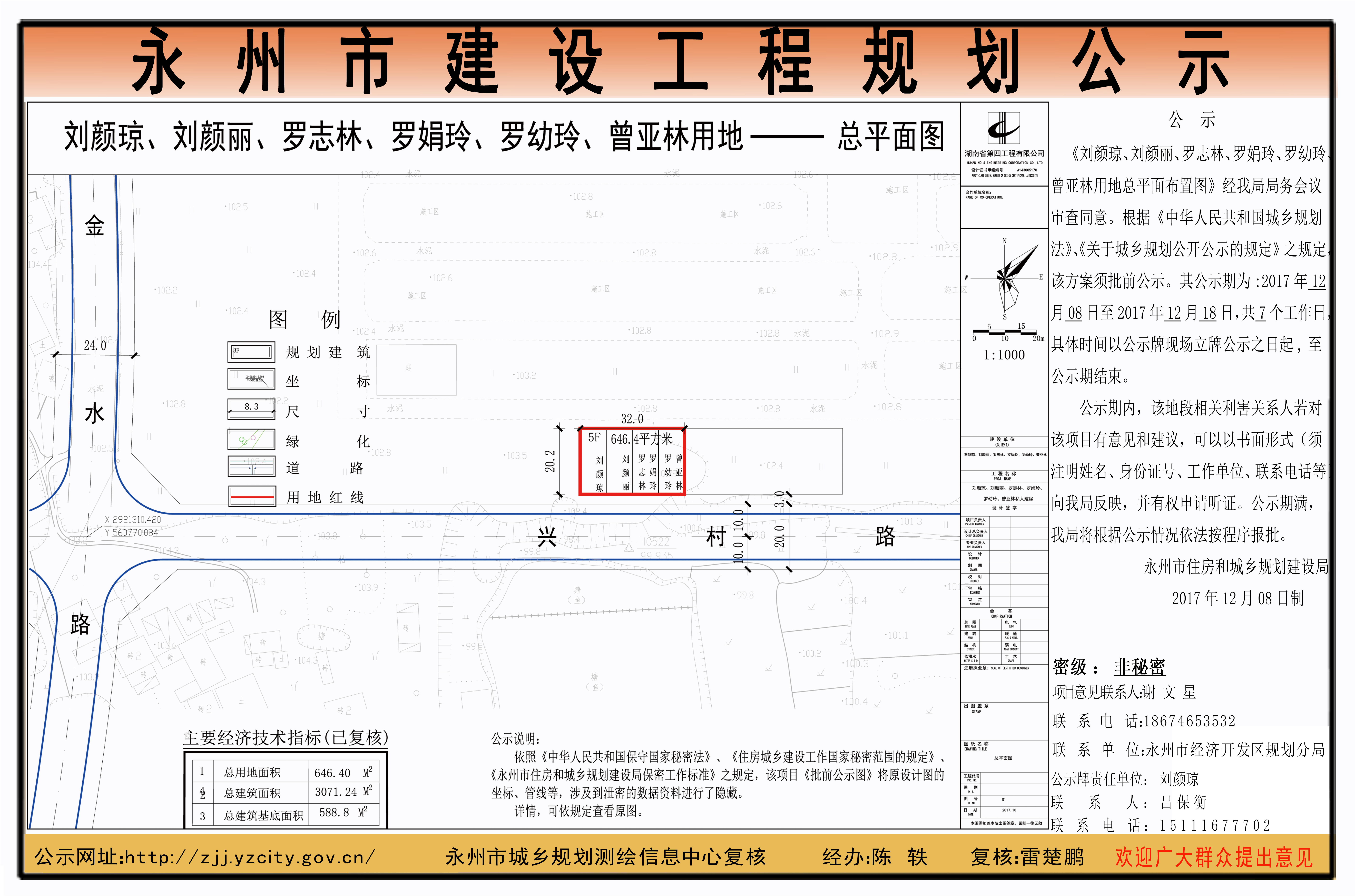 《刘颜琼、刘颜丽、罗志林、罗娟玲、罗幼玲、曾亚林用地总平面布置图》经我局局务会议审查同意。根据《中华人民共和国城乡规划法》、《关于城乡规划公开公示的规定》之规定,该方案须批前公示。其公示期为:2017年12月08日至2017年12月18日,共7个工作日,具体时间以公示牌现场立牌公示之日起,至公示期结束。