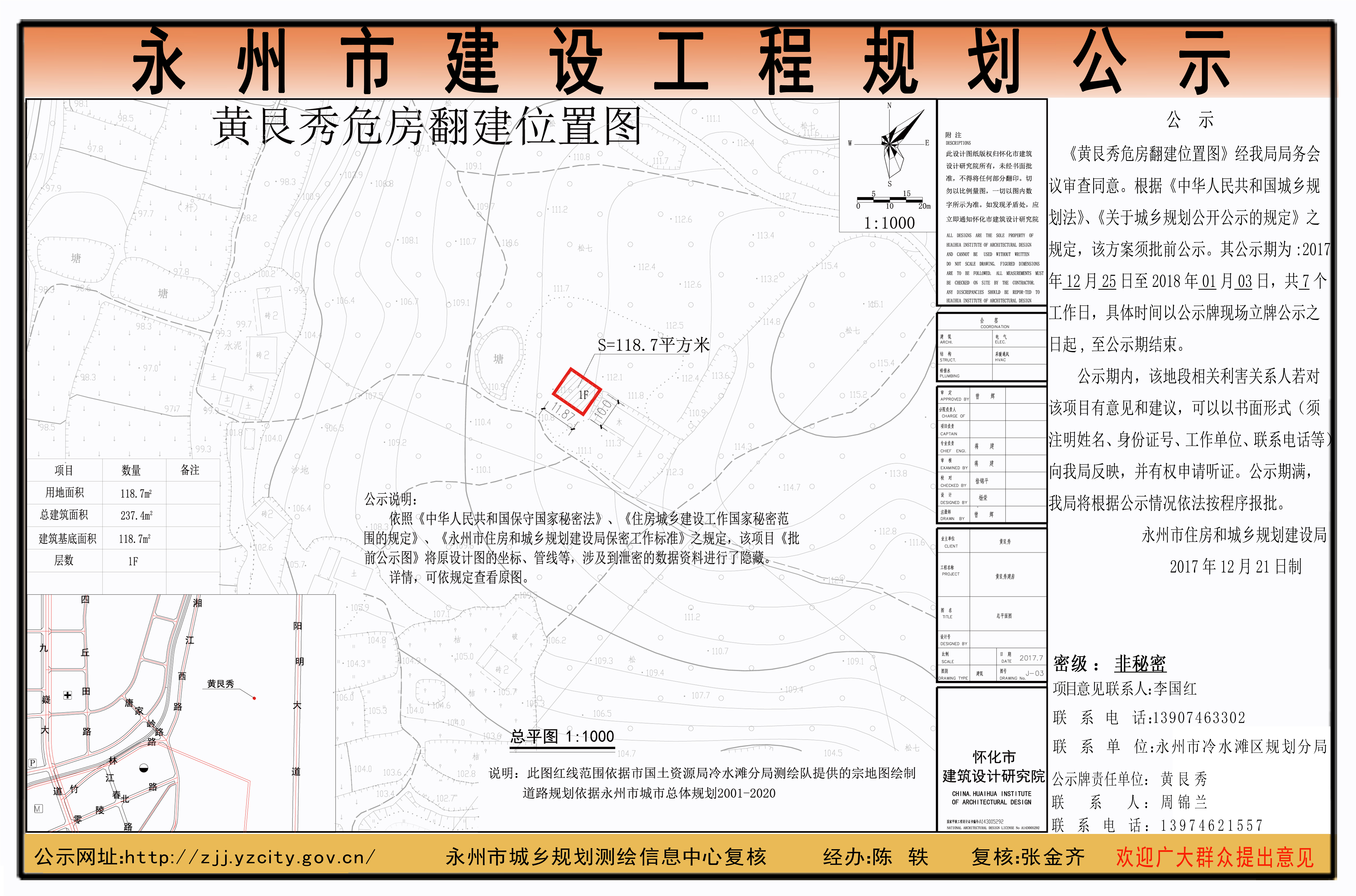 《黄艮秀危房翻建位置图》经我局局务会议审查同意。根据《中华人民共和国城乡规划法》、《关于城乡规划公开公示的规定》之规定,该方案须批前公示。其公示期为:2017年12月25日至2018年01月03日,共7个工作日,具体时间以公示牌现场立牌公示之日起,至公示期结束。