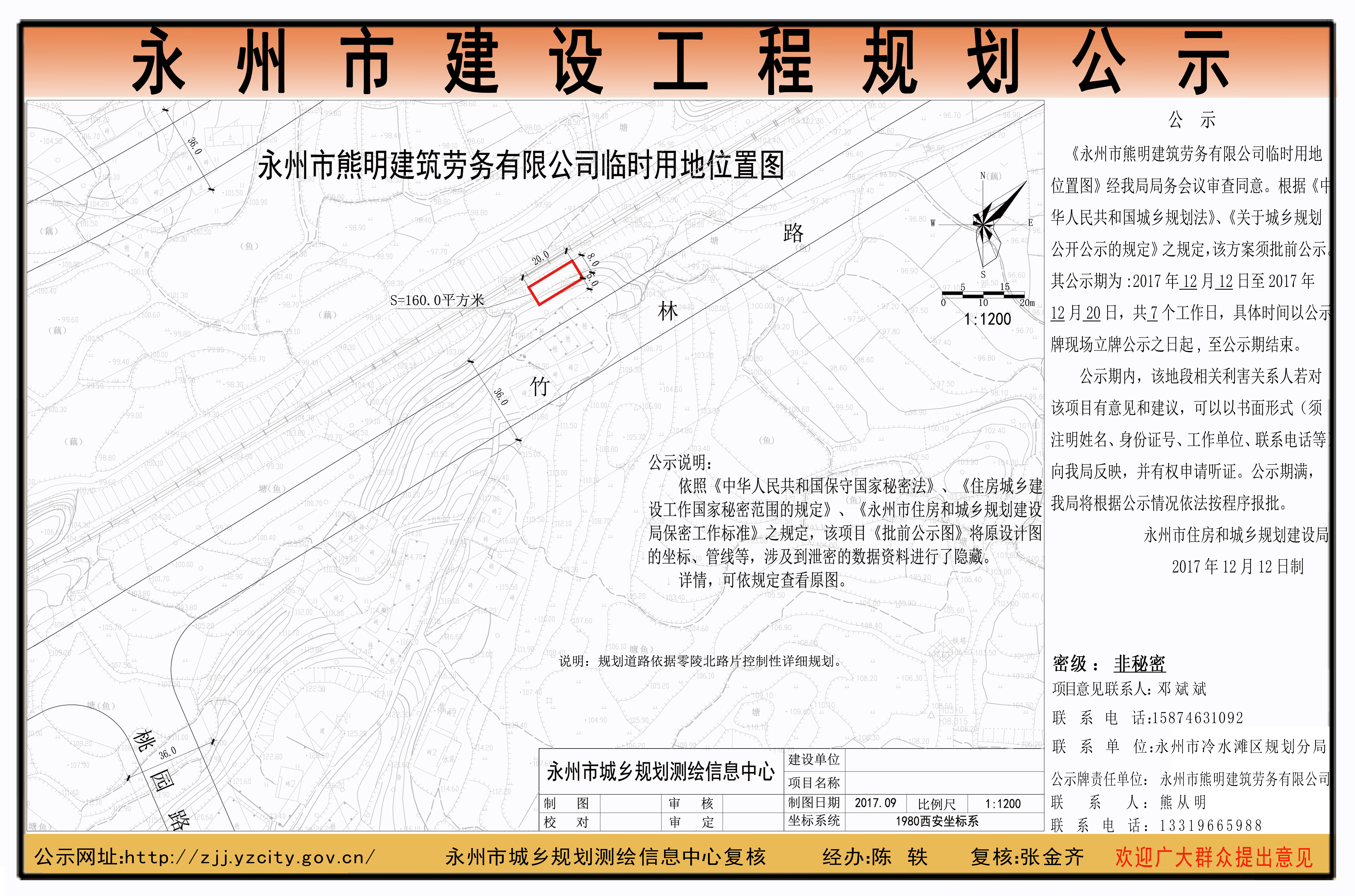 《永州市熊明建筑劳务有限公司临时用地位置图》经我局局务会议审查同意。根据《中华人民共和国城乡规划法》、《关于城乡规划公开公示的规定》之规定,该方案须批前公示。其公示期为:2017年12月12日至2017年 12月20日,共7个工作日,具体时间以公示牌现场立牌公示之日起,至公示期结束。