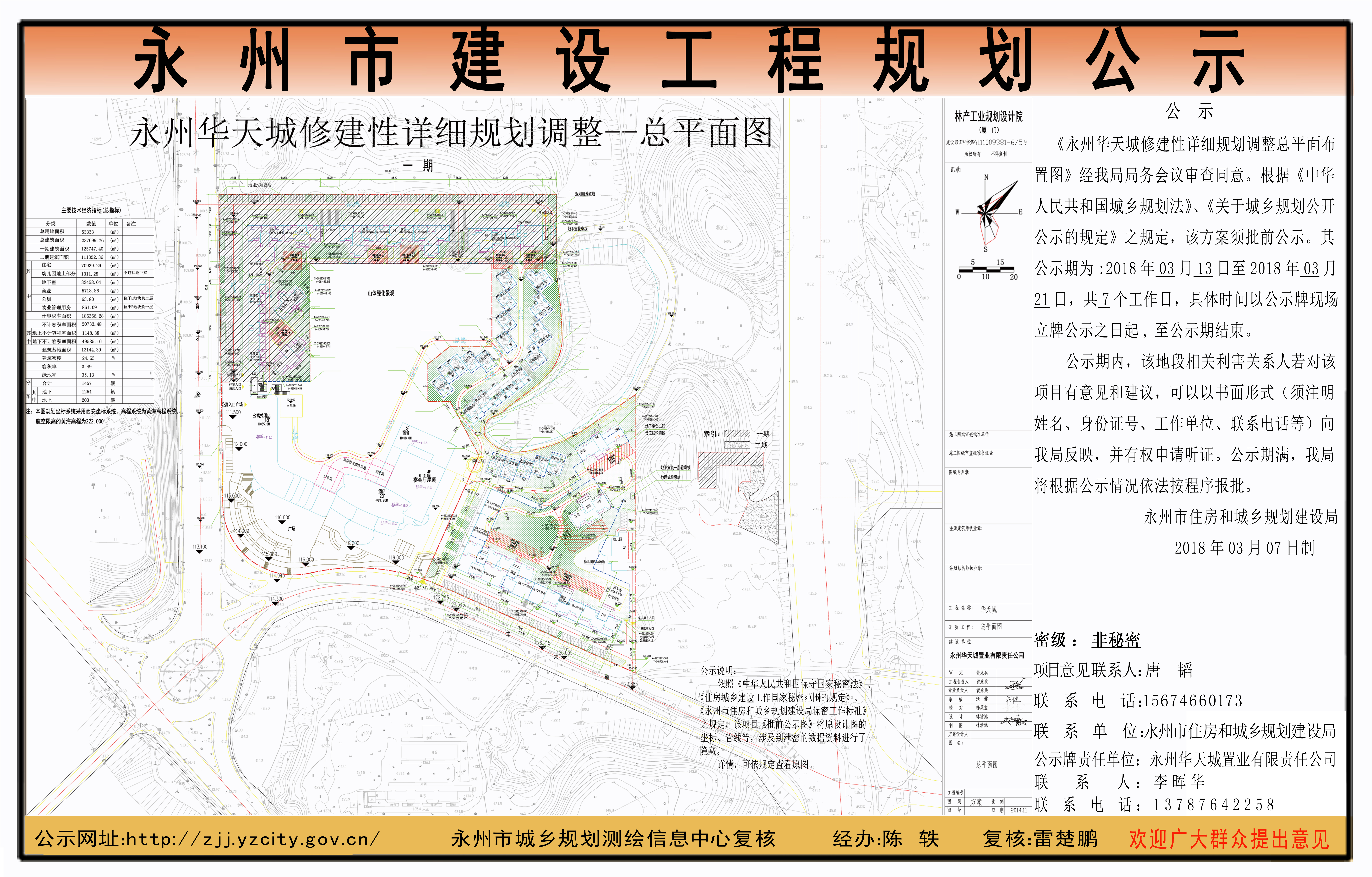 《永州华天城修建性详细规划调整总平面布置图》经我局局务会议审查同意。根据《中华人民共和国城乡规划法》、《关于城乡规划公开公示的规定》之规定,该方案须批前公示。其公示期为:2018年03月13日至2018年03月21日,共7个工作日,具体时间以公示牌现场立牌公示之日起,至公示期结束。