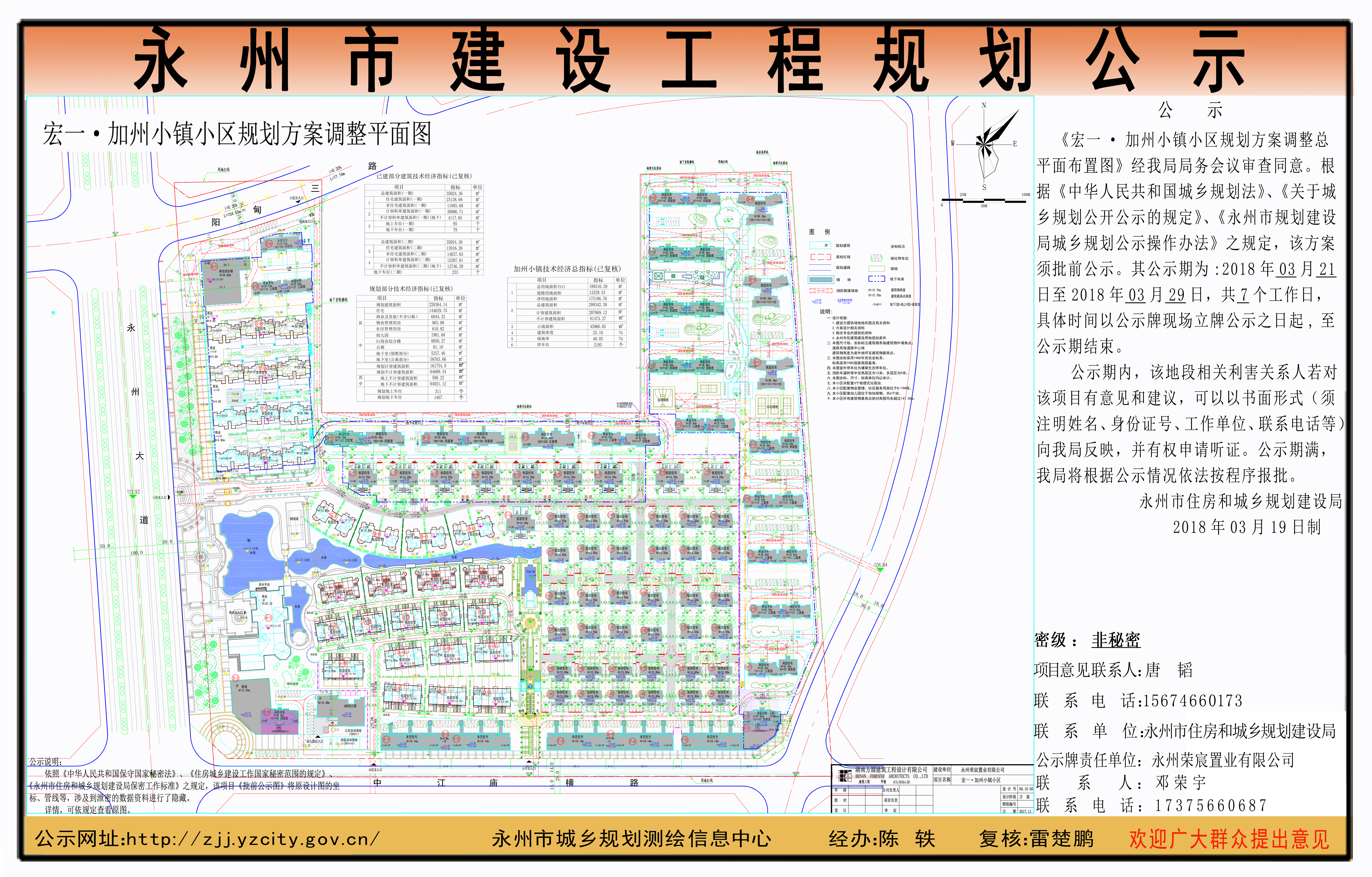 《宏一·加州小镇小区规划方案调整总平面布置图》经我局局务会议审查同意。根据《中华人民共和国城乡规划法》、《关于城乡规划公开公示的规定》、《永州市规划建设局城乡规划公示操作办法》之规定,该方案须批前公示。其公示期为:2018年03月21日至2018年03月29日,共7个工作日,具体时间以公示牌现场立牌公示之日起,至公示期结束。