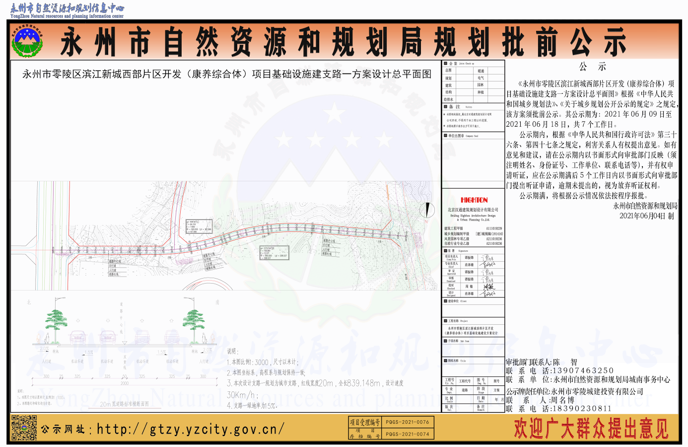 《永州市零陵区滨江新城西部片区开发 (康养综合体)项目基础设施建支路一方案设计总平面图》根据《中华人民共和国城乡规划法》、《关于城乡规划公开公示的规定》之规定,该方案须批前公示。其公示期为:2021年06月09日至2021年06月18日,共7个工作日。