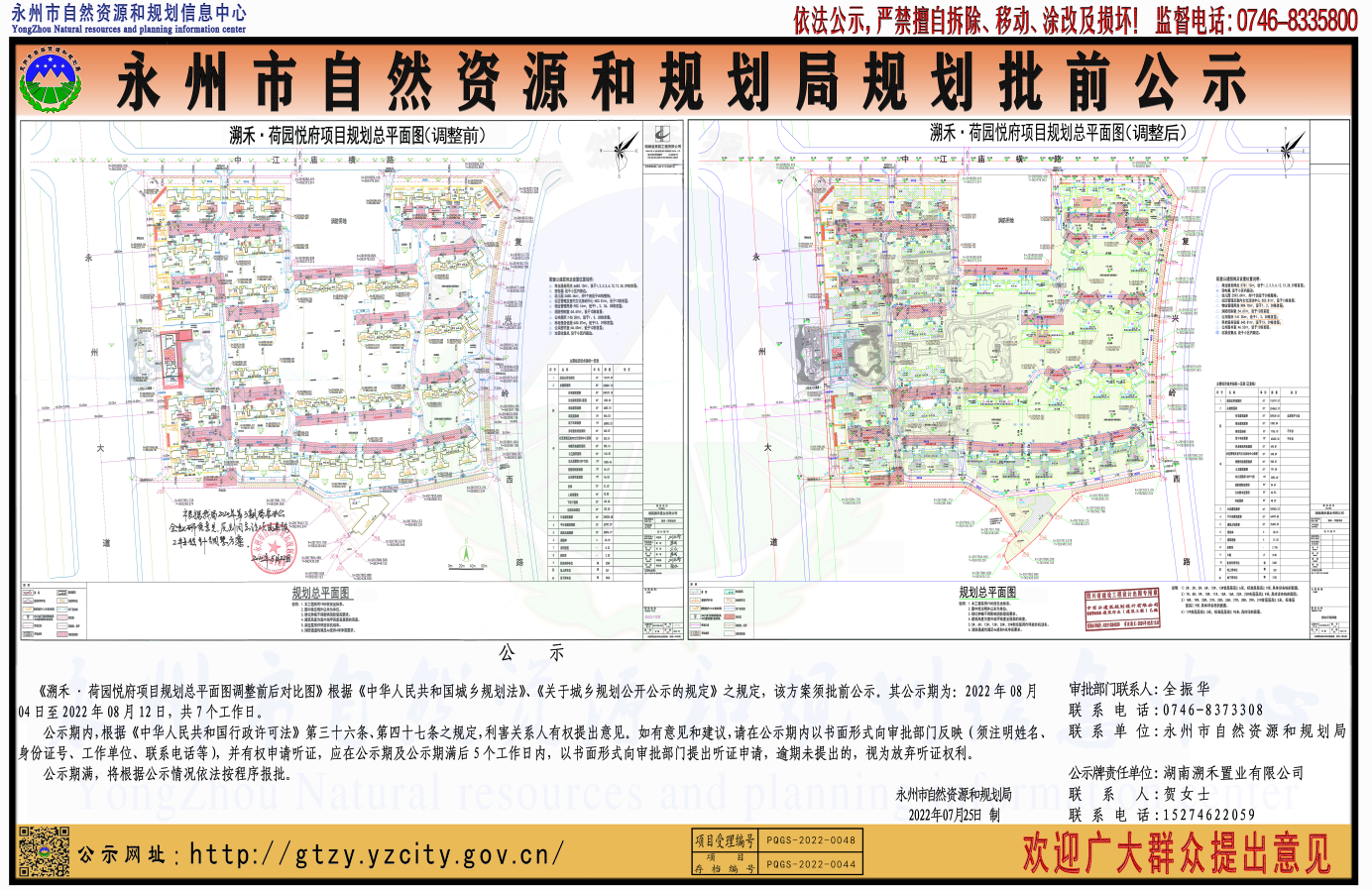 《溯禾·荷园悦府项目规划总平面图调整前后对比图》根据《中华人民共和国城乡规划法》、《关于城乡规划公开公示的规定》之规定,该方案须批前公示。其公示期为:2022年08月04日至2022年08月12日,共7个工作日。