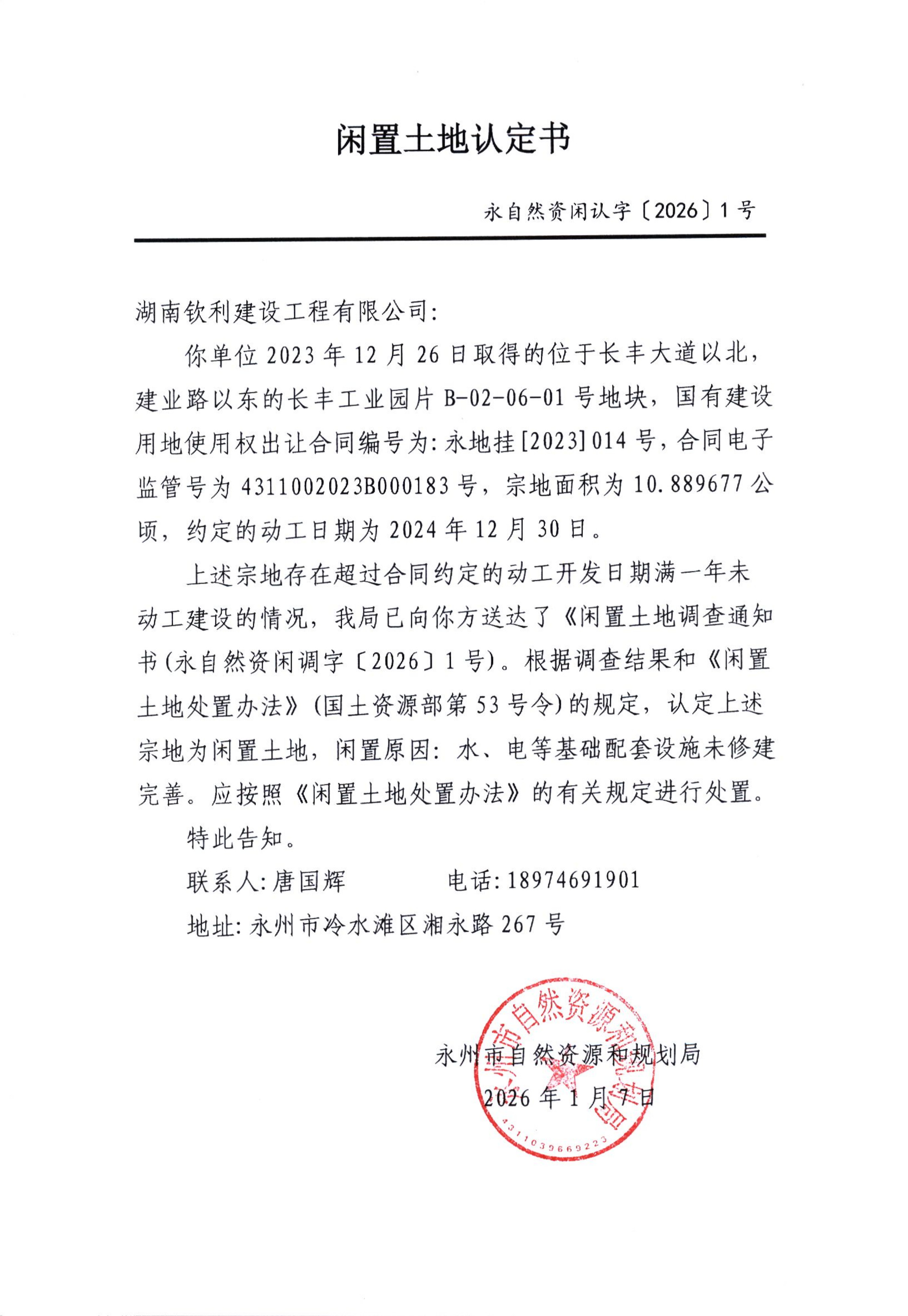 闲置土地认定书(永自然资闲认字[2026]1号)