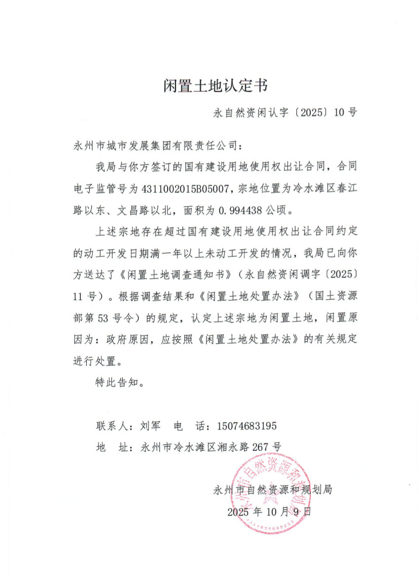 闲置土地认定书(永自然资闲认字[2025]10号)