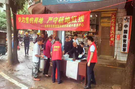 【城中事务中心】节约用地,严守红线。城中事务中心联合冷水滩区岚角山街道办事处,通过悬挂宣传标语、张贴海报、发放宣传册等方式,重点宣传耕地保护、农民建房、地质灾害防治等群众关心的热点问题。该中心发放宣传资料和宣传纪念品共500余份,接受群众咨询30余人次,切实提高辖区群众节约集约用地、严守耕地红线的自觉性和责任意识,形成全民参与、共同保护耕地的良好局面。