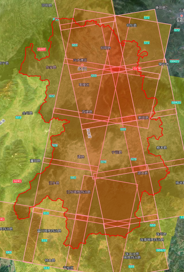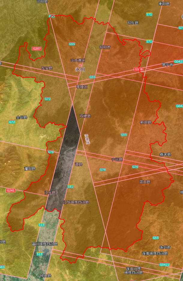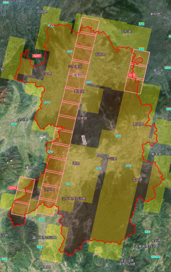 1米分辨率影像共114景,覆盖双牌县、江华县、新田县、蓝山部分区域,其他县区则全覆盖: